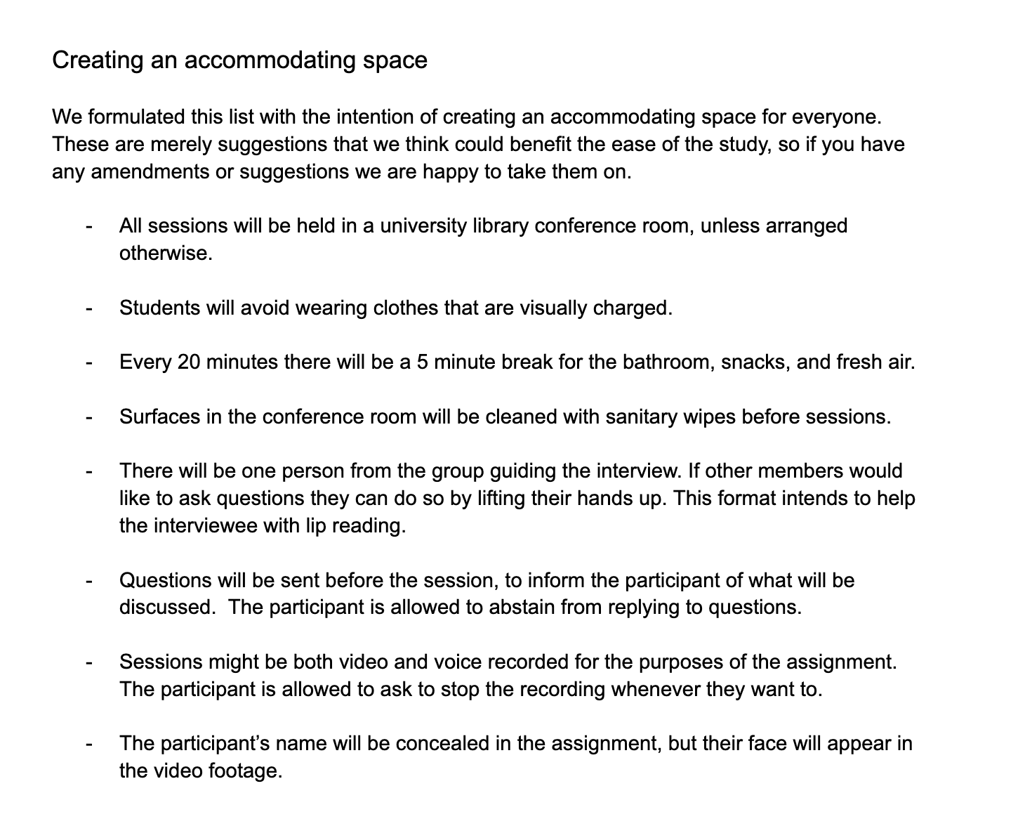 To create guidelines to ensure our research process was accommodating and responsible. These were positively received by her.